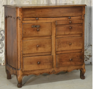 Commode, or trade furniture, in walnut from the Louis XV period. On the front, seven drawers and a pull-out shelf on the upper section. The drop-leaf top is divided into three compartments. Paneled sides and recessed uprights ending in scroll feet.