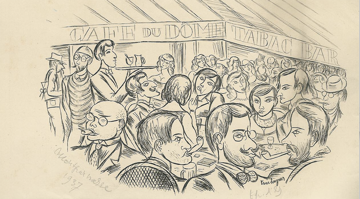 [Above] Marie Laurencin (1883-1956) Femme au collier, 1937, oil on canvas. © UFE, Paris 2022 (detail) [Below] Louis Touchagues (1893 - 1974) Café du Dôme, Montparnasse 1937, lithograph, trial proof © UFE, Paris 2022 (detail)